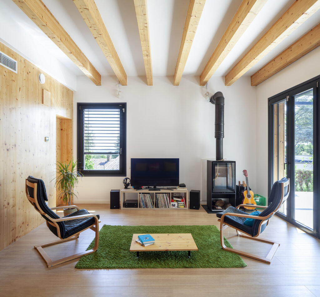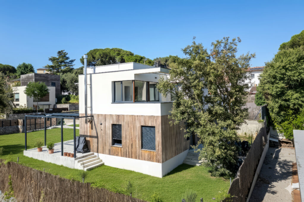 Sin embargo, si esta misma casa se construye con criterios de casa sostenible, con materiales naturales y sostenible como la madera certificada, el resultado cambia drásticamente. Cada m³ de madera utilizada absorbe unos 680 kg de CO₂ eq 1. Per a una casa d’aquestes dimensions, es poden arribar a fer servir uns 80-100 m³ de fusta estructural, més de 60 tones de CO₂ eq fixades i emmagatzemades. Dicho de otra forma: la propia construcción de la casa no solo deja de emitir, sino que se convierte en un reservorio de carbono. Esta casa, en el momento de hacerse realidad, ya ha realizado una aportación positiva al planeta.